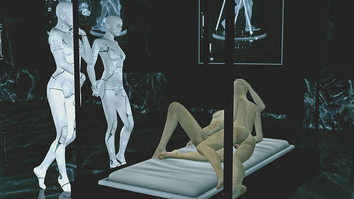 Three cyborg couples enter a newly opened building: the Human Museum. They are confronted with exhibits of humanity: statues of intertwined bodies, anatomical informations, and educational films, reacting emotionally with astonishment, confusion, fear, and curiosity toward the objects in the exhibit. In an inevitable process of machine learning, the six protagonists change during their visit, learning to simulate the rules of arousal and attraction. The pairs are not just the juxtaposition of two cyborgs. Can the machines ever feel what their bodies skillfully mimic: desire?